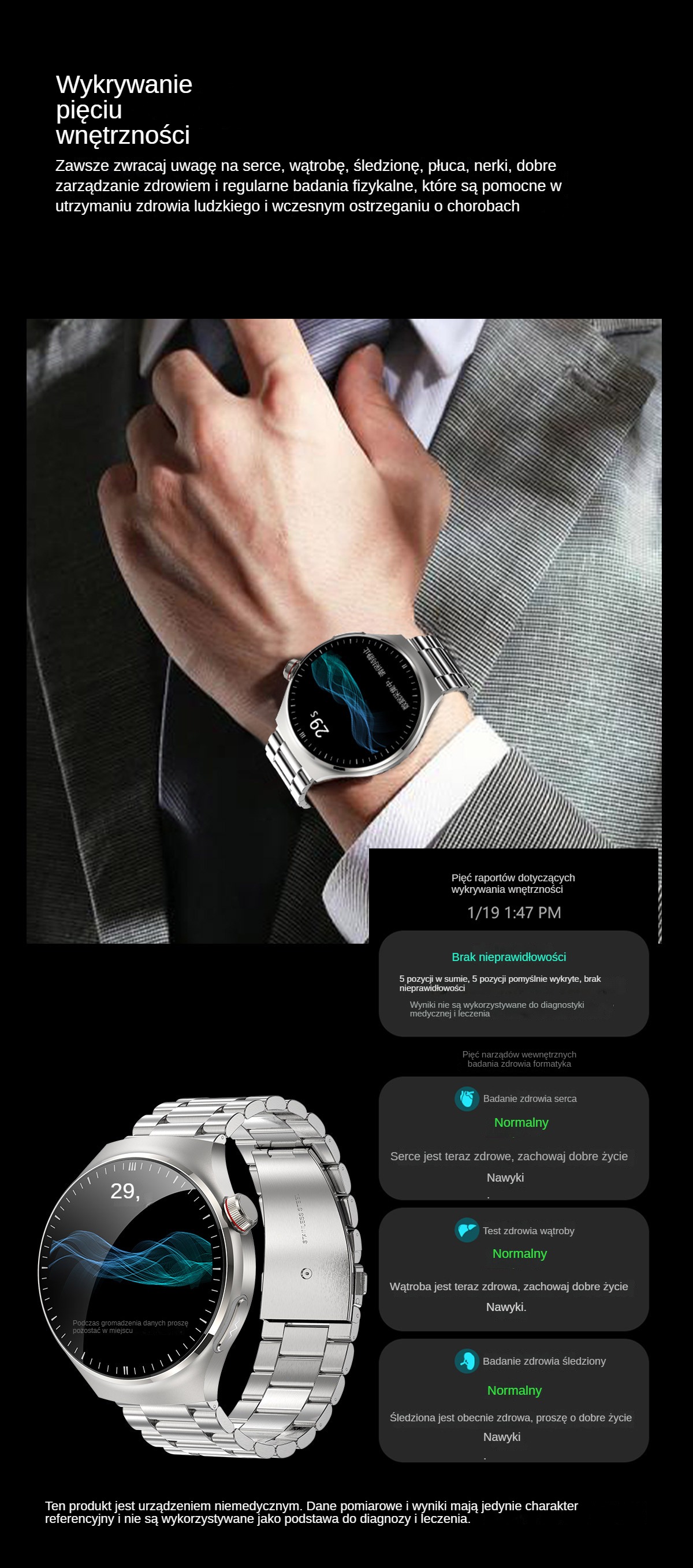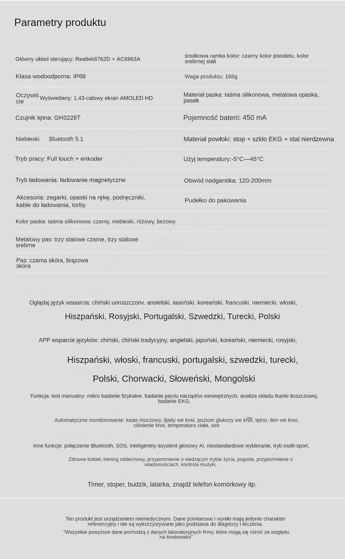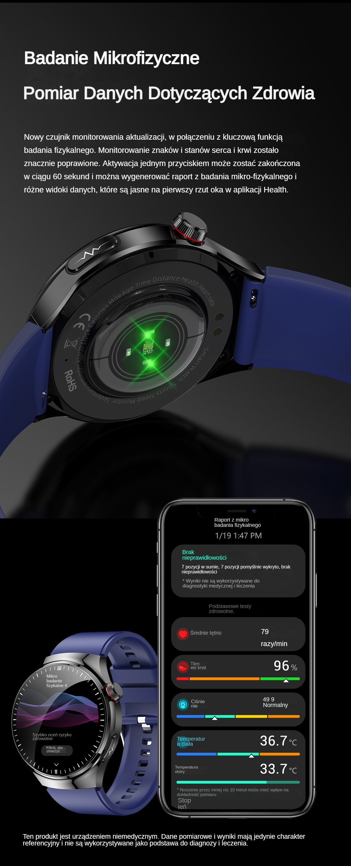 Inteligentne monitorowanie: Wbudowany czujnik monitorowania poziomu glukozy we krwi, poziom glukozy we krwi można mierzyć w czasie rzeczywistym poprzez kontakt ze skórą, bez konieczności dodatkowego pobierania krwi lub pobierania próbek.